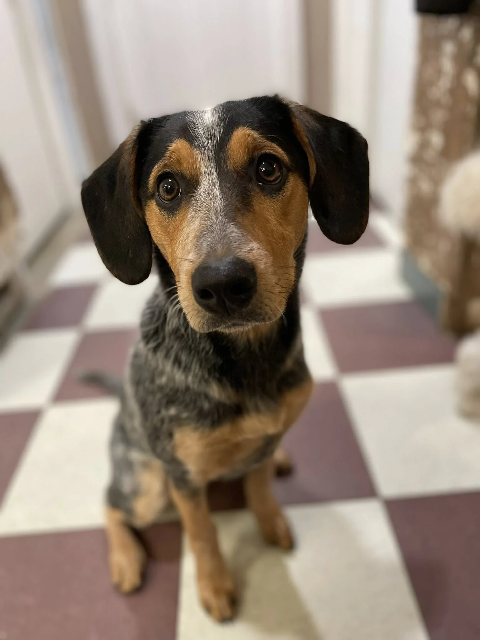 Abby is a 6 month old Heeler x Beagle ( our best guess) who is about 30 lbs . She is as smart as she is cute!